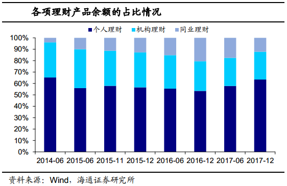 17年內理財規模先降后增,反映監管趨勢。進一步的,17年內理財規模整體呈現先降后增,其中17年6月規模下降到28.38萬億,下半年則小幅反彈至29.54萬億。一方面是17年上半年監管較嚴,尤其是“三三四”檢查等相關政策,都直指銀行的表外和同業業務,導致理財收縮明顯。另一方面是資管新規遲遲沒有落地,銀行也不敢貿然新增理財規模。下半年監管進入相對平穩期,資管新規的征求意見稿也于11月公布,理財規模則出現小幅反彈。