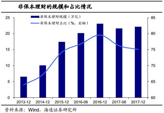 債券、非標、存款配置占比均下滑。資產配置方面,截至17年底,理財配置債券12.46萬億元、占比42.19%,相比16年末分別下滑2500億和1.57個百分點。其中利率債占比8.1%,較16年末的8.7%下降0.6個百分點,信用債占比34.1%,相比16年末的35.1%下降1個百分點左右。而現金和銀行存款、非標的配置比例分別為13.91%和16.22%,相比16年末分別下滑2.71和1.27個百分點。