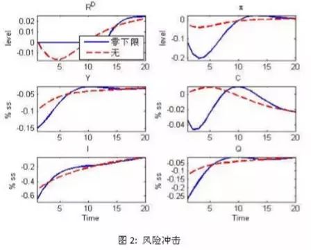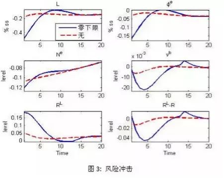 央行的政策利率無摩擦地傳導至銀行間利率,然而從銀行間利率向存款利率的傳導并不完全。如果銀行能將負利率順利傳導至存款,名義存款利率應該下降到-2%。如果存款利率不能與政策利率一樣下調到零以下,銀行的凈利差就會下降。這個結果與現實中實施負利率 的表現一致。具體而言,由于存款利率受到零下限的限制,剔除通脹的實際存款利率就明顯 上升,對銀行的負債成本造成了沉重負擔,壓縮了銀行的凈利差和利潤。銀行的利潤下降會侵蝕銀行凈資本,由于監管對于銀行杠桿率的約束,凈資本的下降會降低銀行的放貸能力, 造成信貸供給也下降。根據給定沖擊水平的模擬結果,銀行的信貸供給下降了 50%,整個經 濟體陷入信貸緊縮。 總體而言,當名義存款利率不能低于零下限,利率的波動在很大程度上都由銀行部門承擔,銀行的凈利差被壓縮,造成銀行的凈資本和信貸供給下降,加劇沖擊的作用,存款利率下調的粘性嚴重損害了負利率政策的有效性。