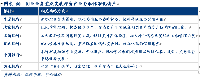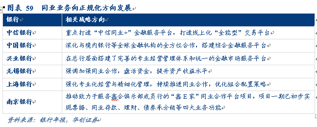 同業業務包括同業資金交易結算、債券投資等同業投資業務、類信貸等非標業務。通過梳理過去三年銀行年報,發現在嚴峻的市場利率環境和嚴監管背景下,銀行普遍開展業務轉型,提出大力發展交易結算業務;在主動投資方面則提高債券等標準化投資比重,而對于類信貸等同業非標業務明顯壓縮。