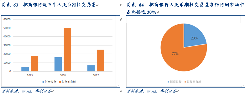 避險業務層面,截止2017年第三季度末,“招銀避險”服務的企業已達到3.5萬家,人民幣期權業務量(含自營和代客)7,309.85億元;機構客戶衍生品交易量6,330.27億元,同比增長50.21%;機構客戶衍生品交易收入 6.53 億元,同比增長 3.32%。根據中國外匯交易中心數據,招商銀行人民幣期權銀行間市場交易量連續三年全市場排名第一。