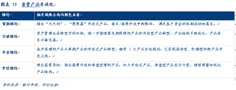 在資產配置方面,主動壓縮非標業務,推動非標轉標;在理財業務資金來源方面,依據自身稟賦,大力拓展私人銀行業務、對公業務;在產品設計方面,推出凈值化產品和開放型產品,逐步完善投資者教育。