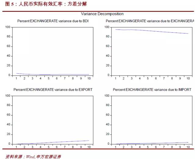 我們采用方差分解模型來研究BDI指數(shù)、進出口對人民幣實際有效匯率波動情況的影響。所謂方差分解,即研究匯率的波動(方差)有多少是由BDI、進口、出口以及自身變動貢獻的。