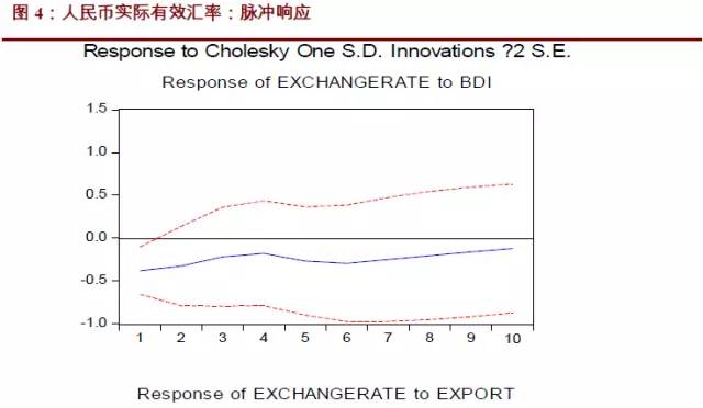 我們采用脈沖響應(yīng)模型來研究BDI指數(shù)、進出口對人民幣實際有效匯率的動態(tài)影響。所謂脈沖響應(yīng),即研究BDI指數(shù)、進口、出口當期變動一單位,會引發(fā)人民幣實際有效匯率在未來若干期的何種變化。