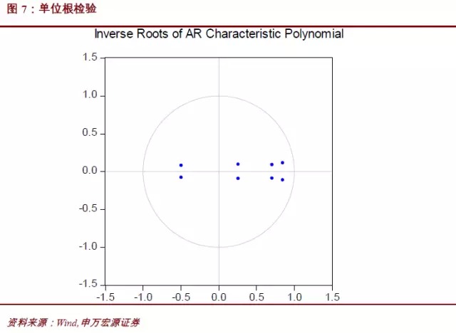 由圖7可知,VAR模型的6個單位根的倒數(shù)都在單位圓內(nèi),也就是說,BDI指數(shù)、進出口、人民幣實際有效匯率的變動都是平穩(wěn)的。