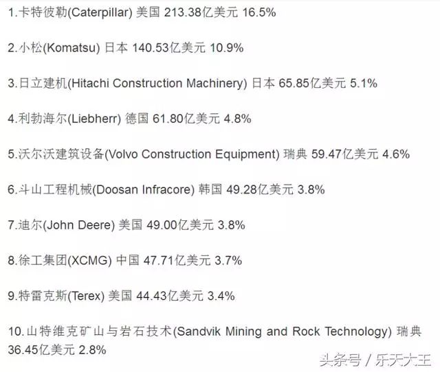 以上是2016年的數據,全球前十,美國有3家,第一名和第7、9名,總市場份額23%。中國只有一家上家上榜,徐工集團,排名第8,市場份額3.7%,完敗。