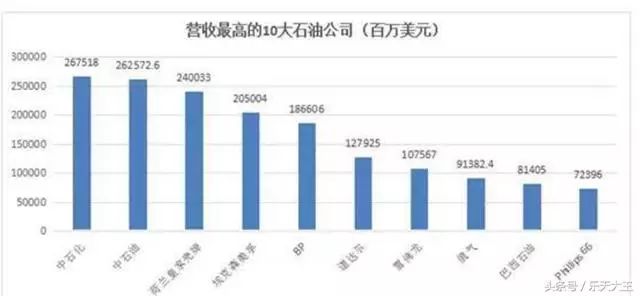 全球石油公司營收前十名,兩家中國的,分別位列一、二名。美國只有一家埃克森美孚,排第四。