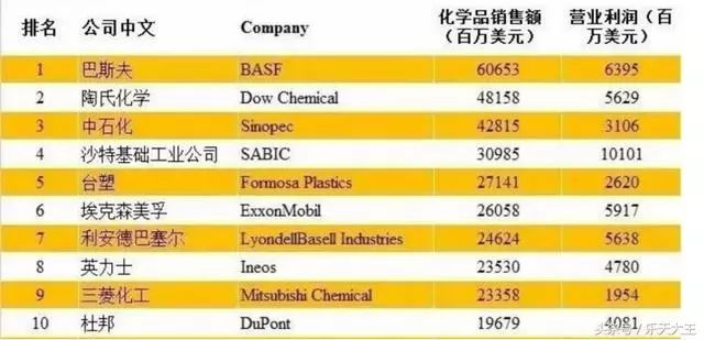 化工企業,全球前十名,美國有三家:陶氏、埃克森美孚、杜邦。中國只有一家,排第三,美國贏。