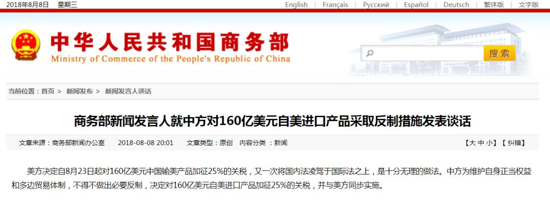 針對美方?jīng)Q定自8月23日起對約160億美元中國輸美產(chǎn)品加征25%的關(guān)稅,商務(wù)部新聞發(fā)言人8日發(fā)表談話指出,美方這一行為又一次將國內(nèi)法凌駕于國際法之上,是十分無理的做法。中方為維護(hù)自身正當(dāng)權(quán)益和多邊貿(mào)易體制,不得不做出必要反制,決定對約160億美元自美進(jìn)口產(chǎn)品加征25%的關(guān)稅,并與美方同步實(shí)施。