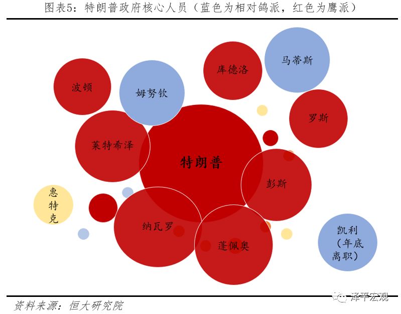 經(jīng)過特朗普頻繁更換內閣、白宮高層官員,當前與對外貿易及經(jīng)濟直接相關的主要高層,如貿易代表、國家貿易委員會主任、商務部長以及首席經(jīng)濟顧問等,均已全面鷹派,符合特朗普政治主張;而與內政、外交等相關的核心高層,如副總統(tǒng)、國務卿、國防部長、司法部長等,也逐步轉化為強硬鷹派或聽命于特朗普。白宮內部理性主義和國際主義的聲音日益消退,代之以民粹主義,對華全面強硬。