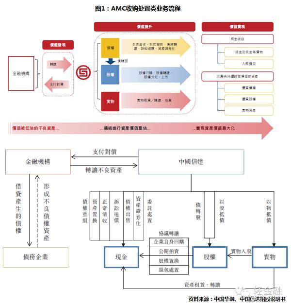 收購重組類業務則指AMC在不良資產的收購環節,即在確認債務債權關系的基礎上,根據不良資產風險程度確定 實施債務或資產重組手段,并與債務人及相關方達成重組協議的業務。主要針對流動性暫時出現危機的企業,提供個性化定制的重組手段,進行信用風險重新定價并 將風險信用化解前移,發掘資產價值,在風險可控的情況下追求更高的重組溢價。
