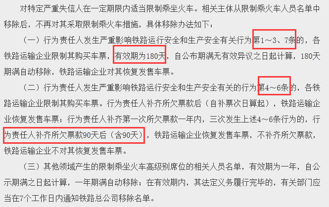 “意見”中指出,將對特定嚴重失信人在一定期限內適當限制乘坐火車。相關主體從限制乘火車人員名單中移除后,不再對其采取限制乘火車措施。