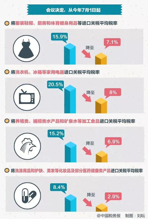 從今年7月1日起,將服裝鞋帽、廚房和體育健身用品等進(jìn)口關(guān)稅平均稅率由15.9%降至7.1%;