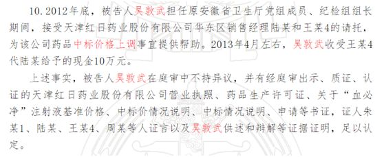 也就是說,吳敦武幫助上市公司紅日藥業(yè)提高了中標價格后,收受了10萬元賄賂。