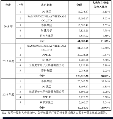 《電鰻快報》(原號外財經)還注意到,華興源創的主要產品應用于國內外知名的平板或模組廠商以及消費電子終端品牌商,下游行業集中度較高,受此影響,公司來自主要客戶的收入較為集中。2016年度、2017年度和2018年度,公司來自前五大客戶的銷售收入占營業收入的比例分別為78.99%、88.06%和61.57%,主要包括蘋果、三星、LG、夏普、京東方、JDI等行業內知名廠商。