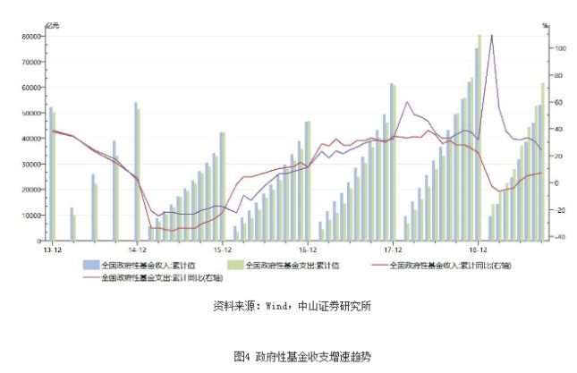 第三,2019年以來,政府性基金支出增速高于收入增速,主要是收入增速較去年出現了明顯回落,政府性基金收支缺口較去年明顯擴大。政府性基金收入增速在一季度大幅回落后小幅回升,可能與土地市場部分回暖有關。政府性基金支出增速在一季度異常飆升后回落至正常區間,可能與基建項目在一季度集中推出有關。