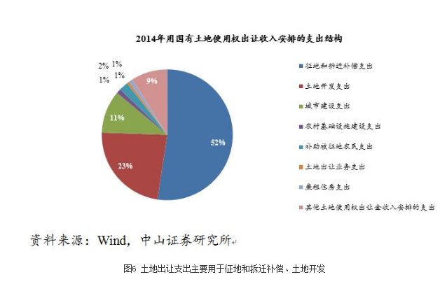 2019年以來,土地出讓支出增速出現了明顯回落,即政府用于征地和拆遷補償、土地開發、城市建設等方面(如圖6所示,2014年征地和拆遷補償、土地開發以及城市建設占土地出讓支出的86%)的支出增速回落,但政府性基金支出增速在較高水平保持平穩,說明政府用于除土地出讓支出以外項目支出增速明顯增加。根據財政部的說明,政府性基金支出一般可以分為七類:交通基礎設施建設、水利相關工程、城市維護建設(土地出讓收入支出在此類中)、社會事業發展、移民和社會保障、生態環境建設以及其他項目。所以,政府應該是在除城市維護建設以外的項目上投入有所增加。