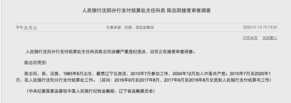 中央紀委國家監委駐中國人民銀行紀檢監察組1月15日晚間發布消息,人民銀行沈陽分行支付結算處主任科員陳志陽涉嫌嚴重違紀違法,目前正在接受審查調查。根據公開簡歷,陳志陽,男,漢族,1983年6月出生,籍貫遼寧瓦房店,2010年7月參加工作,2004年12月加入中國共產黨。2010年7月至2020年1月,在人民銀行沈陽分行支付結算處工作。(其間:2016年9月至2017年8月,2017年9月至2018年8月交流到人民銀行支付結算司工作)中央紀委國家監委駐中國人民銀行紀檢監察組當晚發布的另一則消息顯示,中鈔國鼎投資有限公司黨委書記、董事長龔士良涉嫌嚴重違紀違法,目前正在接受審查調查。中鈔國鼎投資有限公司官網信息顯示,中國印鈔造幣總公司直屬于中國人民銀行,是集人民幣設計、研發、印制并服務于現金全生命周期管理,致力于貨幣文化產業發展和數字貨幣研究的大型國有獨資企業。中鈔國鼎投資有限公司是一家集貴金屬產品和人民幣衍生品研發制造與銷售、鈔幣鑒定評級、鈔幣及進出口貿易為一體的國有企業。中鈔國鼎成立于2004年,注冊資本金為10億元人民幣,直屬于國家法定貨幣生產企業——中國印鈔造幣總公司,由中國印鈔造幣總公司、上海造幣有限公司、沈陽造幣有限公司、南京造幣有限公司和中鈔長城貴金屬有限公司五大國有企業控股。根據公開簡歷,龔士良,男,漢族,1964年11月出生,籍貫上海市,1987年7月參加工作,2001年12月加入中國共產黨。1987年7月-2014年3月,在上海造幣廠工作。2005年10月-2014年3月,任上海造幣廠副廠長、上海造幣有限公司副總經理。2014年3月-2014年4月,任中鈔國鼎投資有限公司董事、總經理。2014年4月-2017年8月,任中鈔國鼎投資有限公司黨支部書記、董事長、總經理。2017年8月-2019年1月,任中鈔國鼎投資有限公司黨支部書記、董事長。2019年1月-2019年12月,任中鈔國鼎投資有限公司黨委書記、董事長。