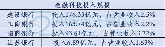 具體來看,建行金融科技投入為176.33億元,占該行營業收入的2.5%,在全部A股上市銀行當中位列首位;其余六大行中,工行金融科技投入為163.74億元,占該行營業收入的2.2%;農行信息科技資金投入為127.9億元,占該行營業收入的2.16%;中行信息科技投入為116.54億元,占該行營業收入的2.12%;郵儲銀行和交通銀行的信息科技投入則分別為81.80億元和50.45億元,占比分別為2.96%和2.57%。
