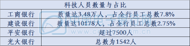不止是資金的投入,各大行為金融科技也在廣納賢才。央行印發的《金融科技(FinTech)發展規劃(2019—2021年)》曾明確要求金融機構要在年報及其他正式渠道中完整披露科技人員數量與占比,在已公布的年報數據中,工行的金融科技人員數量和占比較大,截至2019年年末,該行金融科技人員數量達3.48萬人,占全行員工的7.8%;建行緊隨其后,科技類人員數量為10178人,占全行員工的2.75%;股份行中,平安銀行科技人員數量超過7500人,光大銀行科技人員達1542人。