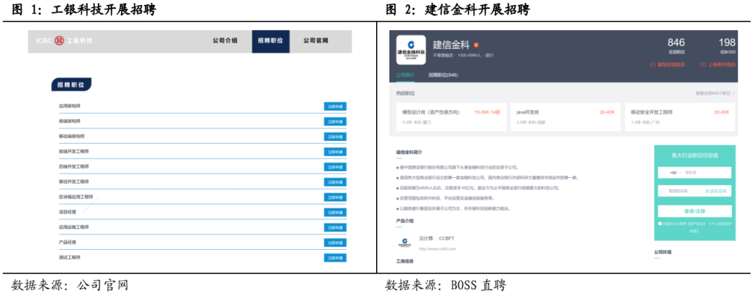 我們認為金融機構成立科技子公司能通過對外輸出獲得額外收入,更好地招募人才、留住人才,并進行內部孵化和外部合作,從而推動金融集團自身的金融科技能力高質量發展。近兩年來,科技子公司引入市場化運作機制,并采用市場化的薪酬待遇來吸引人才。目前通過百度搜索“金融科技子公司招聘”,可以彈出建信金科、工銀科技、中銀金科等公司的大量招聘信息,招聘崗位涵蓋一般的開發崗位、項目管理到較高級的架構設計等。科技子公司不僅聚焦增加整體科技人員規模,還著重于提高整體科技人員的績效。通過引入良性的競爭機制,根據個人能力和經驗來定薪,不再和集團統一的行政等級和體系掛鉤,并且采用更嚴格的考核機制,有助于解決人員冗余。通過線下調研,部分科技子公司實行末尾淘汰制,但在薪酬獎勵方面力度較大,超過金融集團內部平均水平。