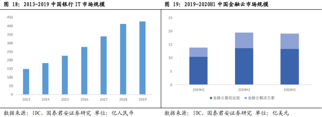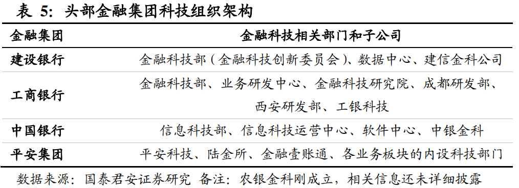 在服務G端客戶上,政務、醫保、醫療、宗教、教育、養老、公益等領域看似和金融主業聯系不大,但通過金融科技子公司參與相關信息化平臺建設,政府機關愿意在金融集團,特別是國有大行開立賬戶、存放財政資金,大行的地方分支機構再結合當地情況,為政府部門提供一些金融特色服務。大型金融集團的科技投入和自主研發占比高,在所有的業務領域基本都有自主研發的系統,只有極少部分對外采購,對中小金融機構的現有業務范圍能夠有效覆蓋。更重要的是,金融集團自身內部更新迭代快,產品和解決方案可持續吸收最新成果和最佳實踐。根據線下調研,大型金融機構的主要業務領域月平均上線更新1-2次,系統擁有不同版本,還能夠形成差異化定價。另外,中小型金融機構自身的系統所包含的功能和業務功能相對有限,使用科技子公司的產品和解決方案,還能幫助中小金融機構拓展新的業務場景,開拓新的業務來源。大型金融集團的科技子公司人員規模龐大,頭部公司人員規模高達數千人,例如建信金科近7000人,金融壹賬通近4000人,而通常中小銀行的科技人員少于500人。大型金融科技子公司基本繼承集團內根據業務領域劃分技術團隊的慣例,不同業務部門的需求一般有特定的開發團隊專職負責服務和運維,例如金融市場部對接的金融市場開發團隊,資產負債部對接資產負債開發團隊,在這種模式下,業務需求的提出人員和業務系統的開發人員彼此熟悉,溝通方便,開發人員能夠精準了解金融業務的趨勢和關鍵要素,開發出的系統更能快速適用于真實業務場景,并且在業務架構的設計上處于領先地位。在金融科技子公司當中,我們基于兩點原因看好金融壹賬通、建信金科、工銀科技、中銀金科。第一,市場需求迅速擴張,根據IDC預測,到2024年整個銀行IT市場的規模將達到近1274億元人民幣,金融云和保險IT市場規模也呈持續增長態勢。第二,上述公司所屬的金融集團業務和科技實力雄厚,其享受到的資源傾斜力度大,更能借助金融集團的資源和平臺優勢實現跨越式發展。IDC報告顯示,2019年中國金融云市場規模達到33.4億美元,同比增長49.6%,銀行IT 市場規模達到425.8億人民幣,并經由IDC預測,到2024年,中國銀行業IT解決方案市場規模將達到1,273.5億,空間相當可觀。另外,根據行業協會調研情況,保險、證券、資管機構也將持續加大科技投入。我們認為只有頭部的金融科技子公司才有廣闊的成長空間,主要原因在于只有所屬金融集團的科技實力較強,才真正具備業務和 IT實踐上的領先性。另外,如果科技子公司規模和體量較小,絕大部分開發人員仍然保留在集團內部,公司無法進行大規模科技輸出,實質與傳統IT部門作為集團內的成本中心無異。未來隨著金融科技市場需求的增長,各家金融科技子公司的行業競爭力將出現明顯分化。根據科技投入情況等公開信息,目前國有四大行、平安集團的科技實力相對較強。金融壹賬通組建于2015年,是在整合平安一賬通、平安科技互聯網云服務平臺、以及前海征信的基礎上成立。建行2018年將整體開發人員全部劃轉進子公司建信金科,由其承擔絕大部分建行自身的開發任務和所有的科技輸出職能,建信金科內設多地事業群、測試中心、數據中心、科技創新中心、基礎技術研究中心。次年中銀金科落戶上海,是中行踐行科技引領戰略、推進金融科技體制改革的一項重大舉措。工銀科技也在2019年成立,目前已經建立了較為成熟的產品體系和輸出模式,依托工行強大的研發力量和社會資源,未來有望在服務G端和F端上取得更多業績。金融機構大幅減少科技投入;監管政策禁止金融機構進行同業科技輸出
