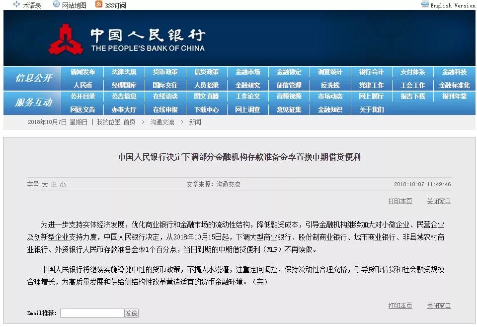 10月7日,央行宣布,從2018年10月15日起下調(diào)大型商業(yè)銀行、股份制商業(yè)銀行、城市商業(yè)銀行、非縣域農(nóng)村商業(yè)銀行、外資銀行人民幣存款準(zhǔn)備金率1個(gè)百分點(diǎn),當(dāng)日到期的中期借貸便利(MLF)不再續(xù)做。