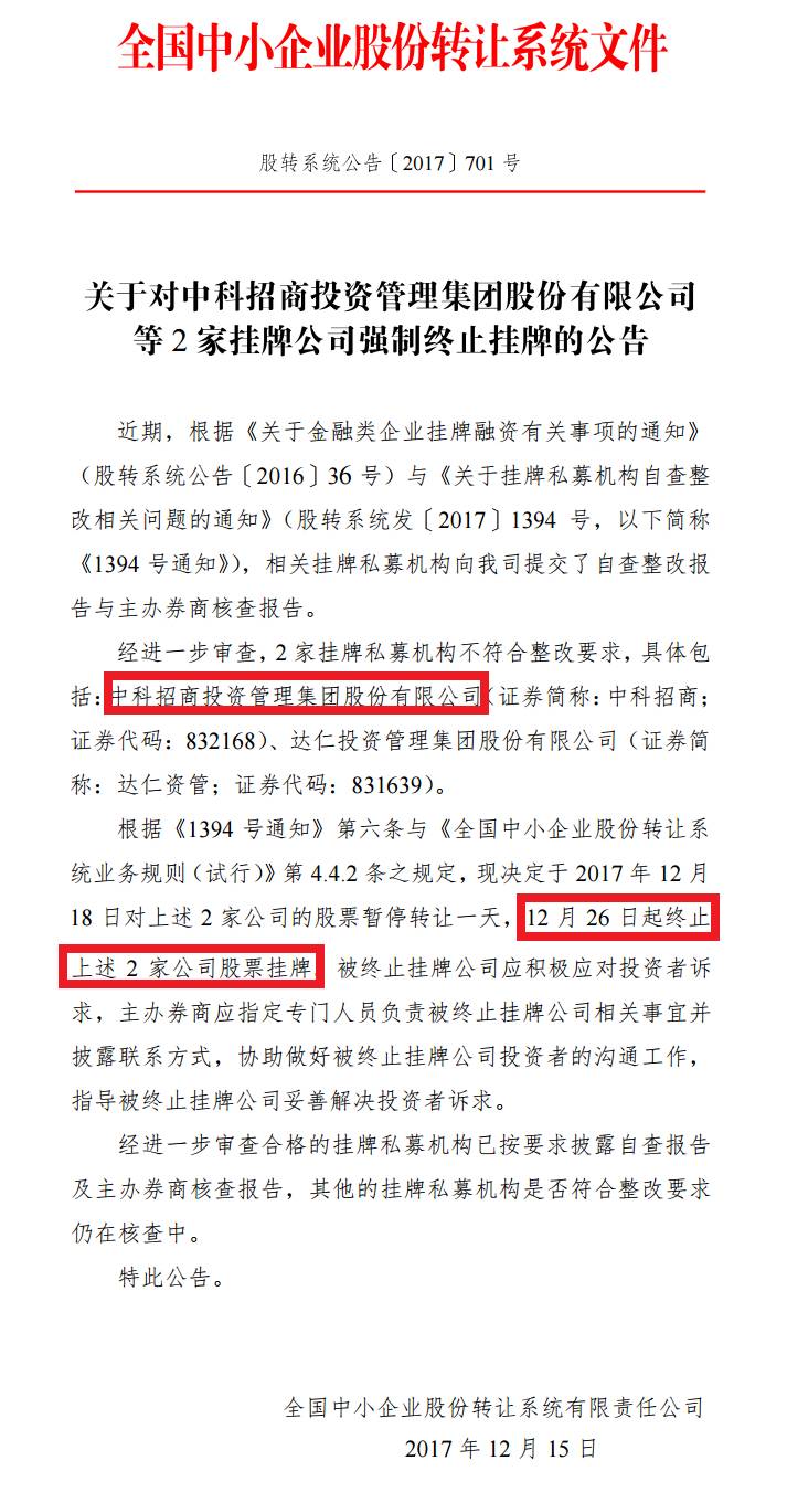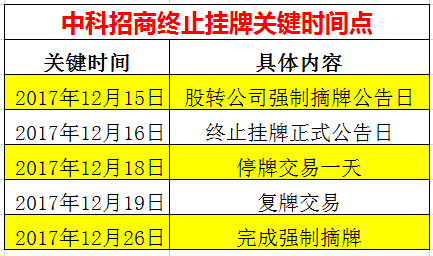 2017年12月18日(周一),中科招商將停牌交易1天,12月19日(周二)將復(fù)牌交易,復(fù)牌期間掛牌公司與主辦券商應(yīng)當(dāng)持續(xù)披露終止掛牌風(fēng)險(xiǎn)(至少三次)。