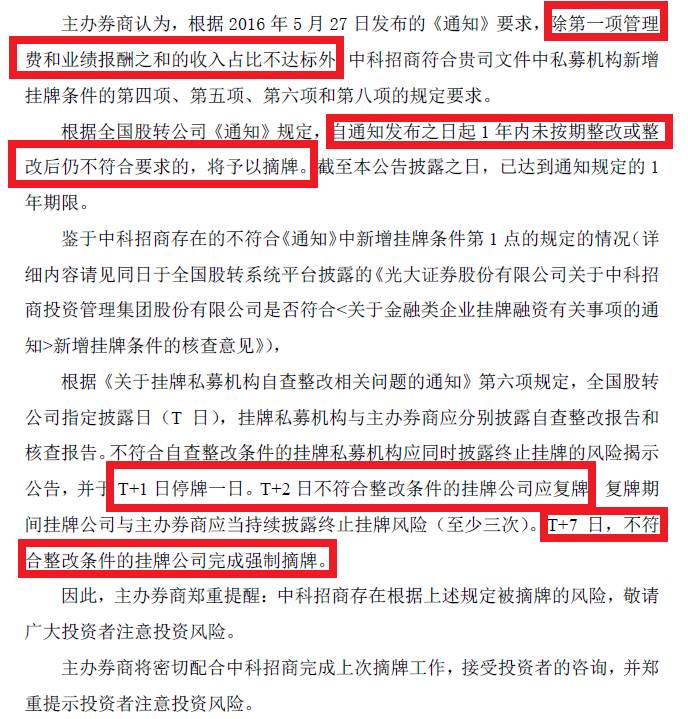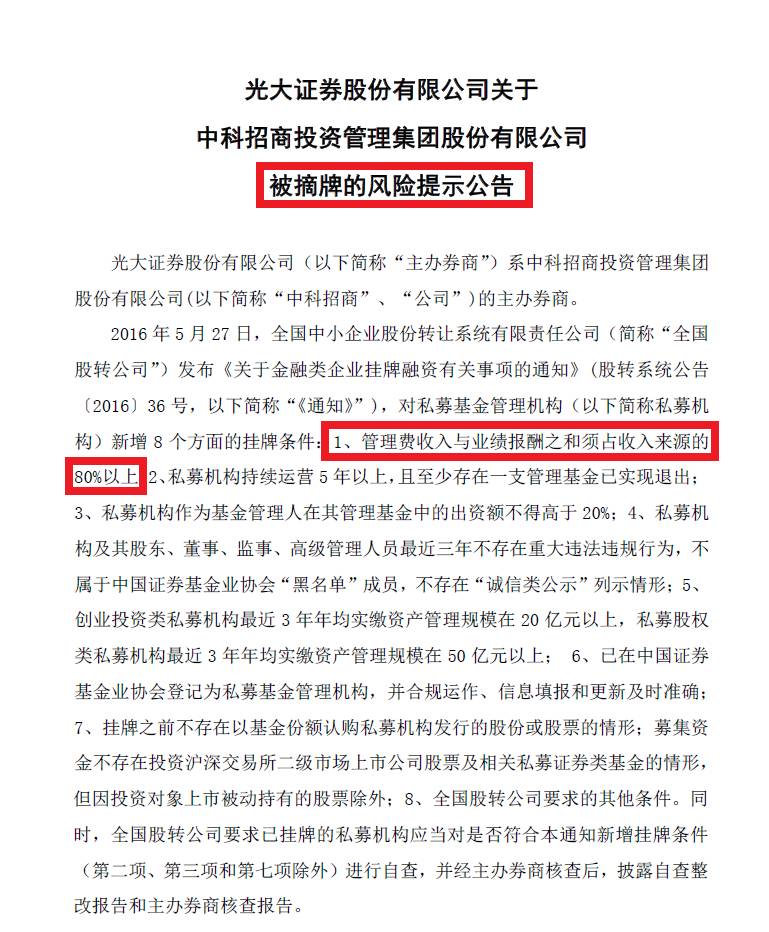 隨后中科招商發(fā)布被摘牌的風(fēng)險(xiǎn)提示公告,公告列舉了2016年5月全國(guó)中小企業(yè)股份轉(zhuǎn)讓系統(tǒng)有限責(zé)任公司發(fā)布《關(guān)于金融類企業(yè)掛牌融資有關(guān)事項(xiàng)的通知》,對(duì)私募基金管理機(jī)構(gòu)新增8個(gè)方面的掛牌條件。