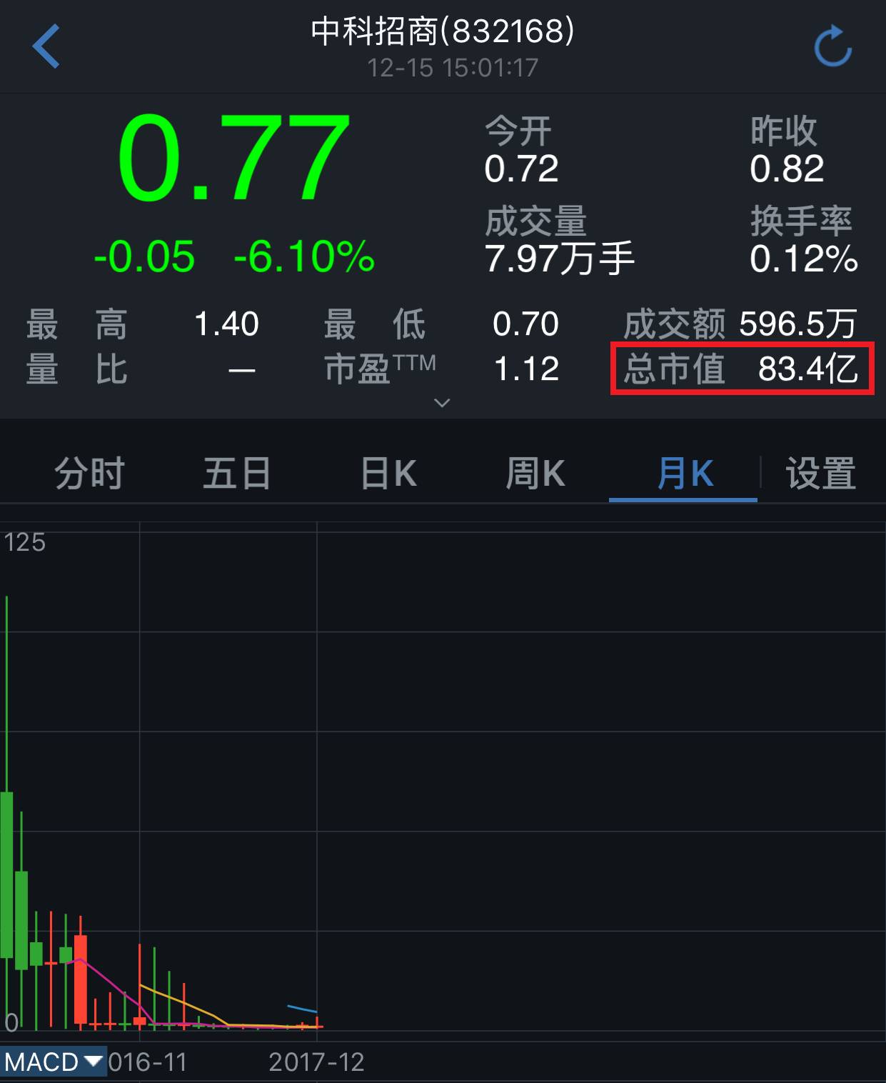 而如今,中科招商的總股本是108億股,12月15日收盤(pán)股價(jià)為0.77元,總市值只有83.83元。