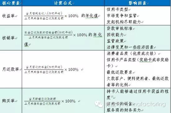 基礎(chǔ)資產(chǎn)的表現(xiàn)是資產(chǎn)支持證券信用風(fēng)險(xiǎn)分析的基礎(chǔ),雖然影響信用卡應(yīng)收賬款信用表現(xiàn)的因素涉及經(jīng)濟(jì)、文化、法律、監(jiān)管、競爭等多個(gè)方面,還受到發(fā)起人風(fēng)險(xiǎn)管理能力、貸款回收能力和客服質(zhì)量的影響,但從國外評(píng)級(jí)機(jī)構(gòu)在構(gòu)建評(píng)級(jí)模型時(shí)重點(diǎn)考察的核心影響因素來看,主要是收益率、核銷率、月還款率和購買率四個(gè)量化指標(biāo)。