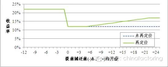 上表給出了一般情況下,受評(píng)證券要達(dá)到目標(biāo)信用等級(jí)需要承受的收益率壓力水平,在實(shí)際評(píng)級(jí)中還需要考慮一些定性因素,包括競爭情況、法律風(fēng)險(xiǎn)、資產(chǎn)池特性、發(fā)起機(jī)構(gòu)再定價(jià)能力等對(duì)折損率的影響。競爭情況是一個(gè)關(guān)鍵因素,因?yàn)槎▋r(jià)高的資產(chǎn)會(huì)受到降低利率維持市場份額的壓力。法規(guī)風(fēng)險(xiǎn)之所以重要,是因?yàn)榉ㄒ?guī)改變對(duì)信用卡收入產(chǎn)生方式有重大影響。資產(chǎn)池的特性也是影響折損率的重要因素,例如,與優(yōu)質(zhì)持卡人相比,次級(jí)信用卡持卡人的利率和其他相關(guān)費(fèi)用相對(duì)要高并且更容易下降,因此對(duì)于次級(jí)持卡人占比較高的資產(chǎn)池就應(yīng)當(dāng)選用更高的折損率進(jìn)行施壓。發(fā)起機(jī)構(gòu)的再定價(jià)能力同等重要,因?yàn)樵谑袌隼噬仙膲毫η榫跋?回收的財(cái)務(wù)費(fèi)用會(huì)減少,如果發(fā)起機(jī)構(gòu)能夠根據(jù)信用卡應(yīng)收賬款的屬性對(duì)其再定價(jià)[22],那么將減緩收益率的下降,因此在對(duì)收益率施加壓力時(shí),應(yīng)當(dāng)考慮發(fā)起機(jī)構(gòu)對(duì)信用卡應(yīng)收賬款的再定價(jià)能力。如圖 1所示,當(dāng)資產(chǎn)組合的收益處于較大的壓力環(huán)境,其收益急劇下降,但是由于利率的上升,發(fā)起機(jī)構(gòu)會(huì)對(duì)資產(chǎn)組合進(jìn)行再定價(jià),因此其收益的下降會(huì)得到一定程度的緩解。當(dāng)然,再定價(jià)影響還要取決于資產(chǎn)組合中固定利率和浮動(dòng)利率兩類資產(chǎn)在組合中的占比。