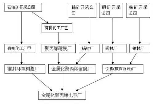 分析供應鏈關系,有兩個最重要的作用。一個是作質量控制,另外一個是作成本分析。有時僅僅考察或控制元器件廠家還不能保證其生產出來的元器件的質量沒問題,還須對元器件廠的關鍵原材料的供應商作評審或考察或控制。比如說,某金屬化聚丙烯電容生產廠,其原材料分為:金屬化聚丙烯薄膜、灌封環氧樹脂、引腳材料等,這些材料都要向不同的供應商采購,而其中金屬化聚丙烯薄膜是非常關鍵的原料,必要時整機廠會對生產金屬化聚丙烯薄膜的廠家進行評審或考察。金屬化聚丙烯電容的供應鏈結構圖可能如下: