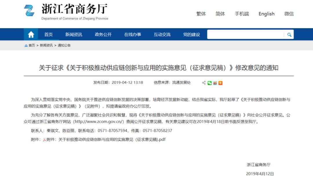 為充分了解各有關方面意見,廣泛凝聚社會共識和智慧,現將《關于積極推動供應鏈創新與應用的實施意見(征求意見稿)》向社會公開征求意見。公眾可通過浙江省商務廳網站(http://www.zcom.gov.cn/)查閱公開征求意見稿,有關意見建議可在2019年4月18日前書面反饋至我廳。