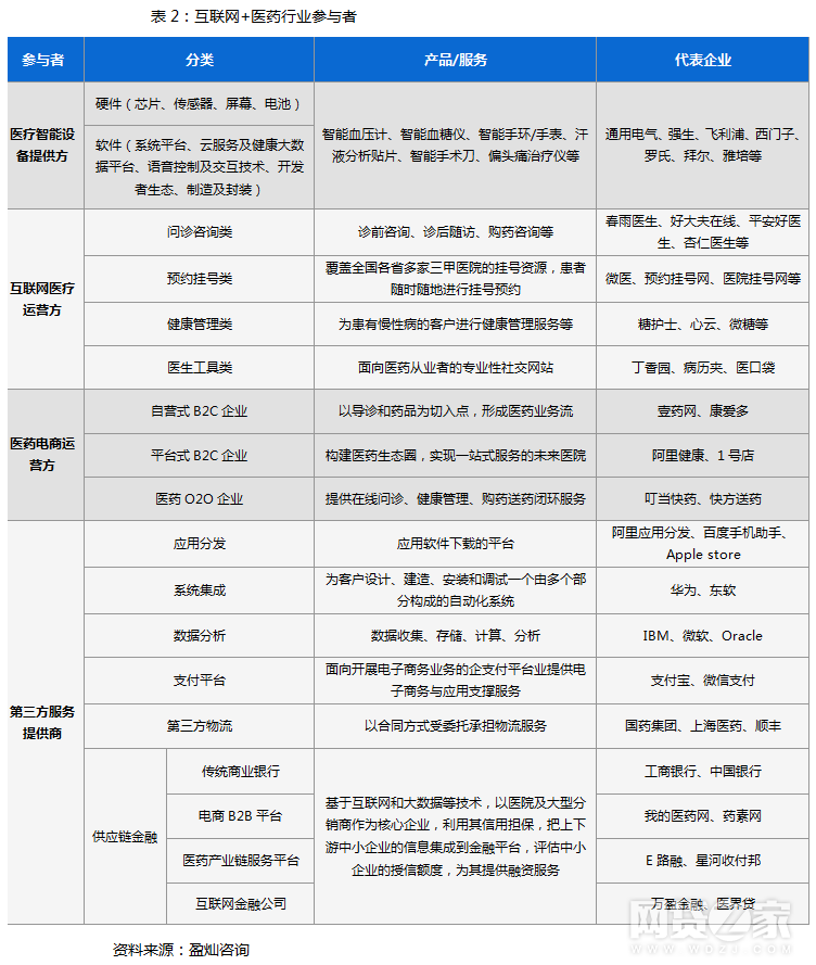 目前,我國互聯(lián)網(wǎng)+醫(yī)藥行業(yè)尚處于發(fā)展初期。在政策不斷促進(jìn)、技術(shù)不斷進(jìn)步的背景下,參與者越來越多,互聯(lián)網(wǎng)+醫(yī)藥行業(yè)的上下游配合度在迅速提升,產(chǎn)業(yè)鏈中的第三方服務(wù)商也迅速成長。縱觀整個互聯(lián)網(wǎng)醫(yī)藥行業(yè),參與者涵蓋醫(yī)療智能設(shè)備提供方、互聯(lián)網(wǎng)醫(yī)療運營方、醫(yī)藥電商運營方、第三方服務(wù)提供商等。