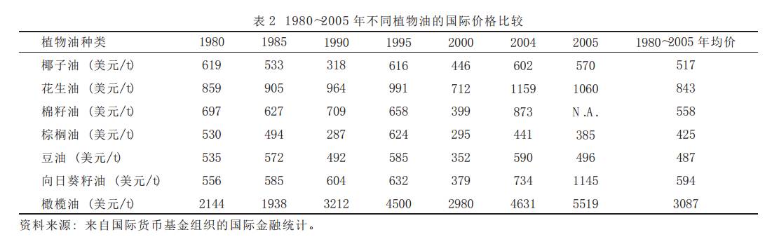 進入21世紀以來,中國植物油消費呈急劇擴大的態(tài)勢,世人關(guān)注的焦點主要集中于大豆及豆油的貿(mào)易變動和國內(nèi)生產(chǎn)狀況,而棕櫚油進口就在這短短的幾年間,就以遠遠超過豆油進口量的態(tài)勢,從2000年的141萬t增加到2005年的456萬t,并成為世界最大的棕櫚油進口國,也成為中國植物油消費中消費量僅次于豆油和菜籽油的第三大植物油品種。可見,棕櫚油已經(jīng)成為中國植物油供給的重要組成部分,從確保植物油供給安全的角度出發(fā),分析世界棕櫚油生產(chǎn)貿(mào)易狀況以及中國棕櫚油進口增加的原因就具有重要的現(xiàn)實意義。雖然趙國志(2005)對世界植物油料油脂的生產(chǎn)貿(mào)易消費進行了介紹,張希財(2005)對棕櫚油的供需和競爭力進行了分析,但對中國棕櫚油進口增加沒有進行詳細的原因分析。因此,本文首先對世界棕櫚油生產(chǎn)與貿(mào)易現(xiàn)狀進行分析;其次,分析中國棕櫚油進口結(jié)構(gòu)及其變動;再次,探討中國棕櫚油進口急劇增加的原因;最后是結(jié)論和建議。
