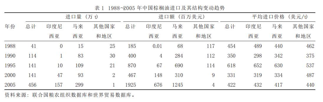 20世紀80年代末以來,中國棕櫚油進口來源國的構(gòu)成變動較大,1988年中國主要的棕櫚油進口國家和地區(qū)分別為新加坡、馬來西亞、奧地利、泰國和中國香港,到2005年中國進口棕櫚油幾乎就全部依賴于馬來西亞和印度尼西亞。(見表1)在中國棕櫚油進口中,來自印度尼西亞的棕櫚油比重上升較快,2005年其比重已經(jīng)達到34%,而馬來西亞的比重則占到65%,這與其20世紀90年代的平均水平74%相比出現(xiàn)了一定程度的下降。中國來自印度尼西亞棕櫚油的進口增加與印度尼西亞棕櫚樹種植面積的擴大以及低價有關(guān),1990~2005年中國進口棕櫚油中,每噸印度尼西亞和馬來西亞的棕櫚油平均價格分別為429美元和449美元,而且只有1995年、2004年和2005年前者的價格才高于后者。