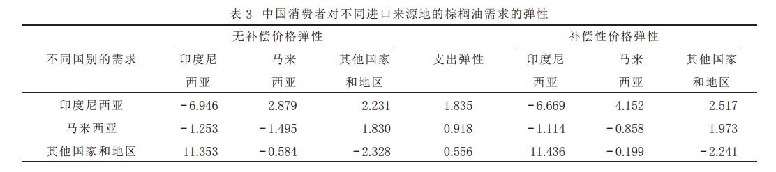 (1)中國消費者對來自棕櫚油進口的需求的自價格彈性為負值且均大于1,特別是對來自印度尼西亞的棕櫚油的自價格彈性值為6.946,表明中國消費者對進口棕櫚油的需求富有價格彈性,對來自印度尼西亞的棕櫚油價格特別敏感;