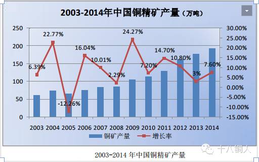 國家統計局最新公布數據顯示,2014年中國共生產1935466噸銅精礦,同比增長7.6%。2014年中國粗煉以及精煉產能不斷擴大,其對銅礦需求保持強勁。