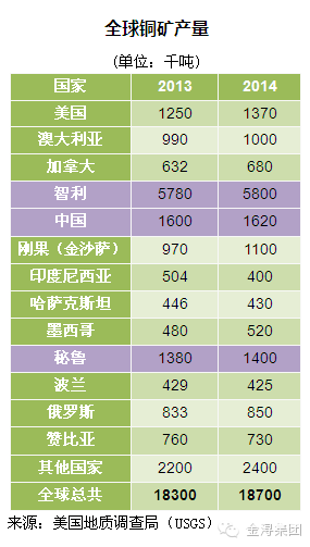 根據美國資源調查局2015年數據顯示,2013、2014年全球銅產量如下:
