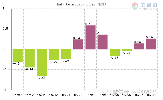 2016年8月,生意社大宗商品供需指數(BCI)為0.26,均漲幅為1.58%,反映該月制造業經濟較上月呈擴張狀態,經濟平穩運行。
