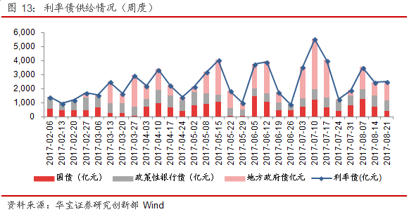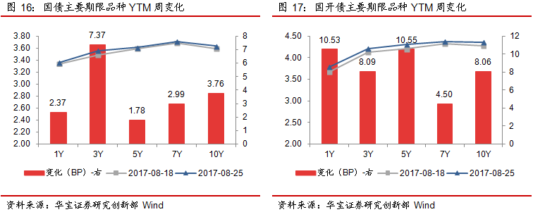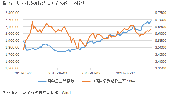 資金面維持偏緊狀態,債券市場收益率小幅走高。上周,央行考慮財政投放、國庫現金定存操作、金融機構法定準備金退繳等因素將投放流動性,公開市場操作凈回籠2500億元,資金面繼續維持偏緊的狀態。資金面的持續緊張,使得債券市場的情緒受到了壓制。此外,供給側改革深化和環保督查的持續發酵引發了市場對于大宗商品持續上漲的擔憂,大宗商品價格的持續上漲也帶動了債券市場收益率的抬升。上周,債券收益率曲線整體向上抬升,10Y國債收益率上行3.8bp至3.63,10Y國開收益率上行8bp至4.36,距5月份的年內高點只有“一步之遙”。一級市場招標也顯示市場情緒較弱。對于信用債而言,收益率整體上行,且上行幅度普遍在7-12bp之間,信用利差進一步壓縮。在基本面、政策面等在短期沒有超預期的情況下,資金面成為目前市場的主要矛盾,資金面的持續偏緊也在一定程度上壓制了債市的表現。
