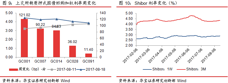 上周,央行考慮財政投放、國庫現金定存操作、金融機構法定準備金退繳等因素將投放流動性,公開市場操作凈回籠2500億元,資金面繼續維持偏緊的狀態。銀行間隔夜質押回購利率收于2.9359%,較前一周下行5.5BP;7天質押式回購收于3.5840%,較前一周上行5.7BP;14天質押式回購收于4.1750%,較前一周下行7.4BP;1個月質押式回購收于4.0926%,較前一周下行4.6BP。7天Shibor收益率收于2.9098%,較前一周上行1.6bp;3個月期Shibor收于4.3689%,較前一周上行2.5bp。交易所市場方面,GC001收于4.2850%,較前一周大幅下行17bp;GC007收于4.2826%,較前一周上行1.34bp。