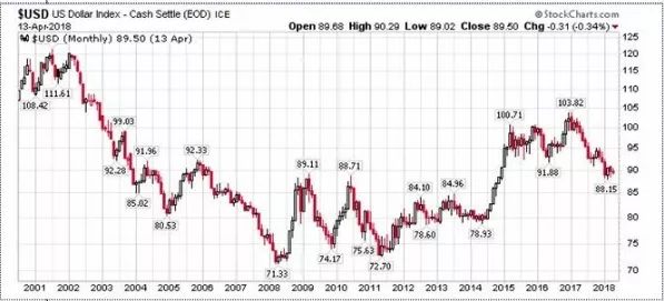 以下是當前美元指數(shù)和2001年對比的情況,從技術(shù)分析角度來說,在美元指數(shù)跌至80整數(shù)關(guān)之前是不存在較強的支撐的,這與Rosenberg的觀點不謀而合。