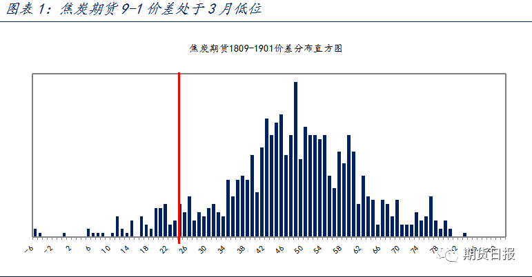 我們截取了近三個月以來的焦炭1809和1901的數據,制作了價差的直方圖。通過價差的分布圖可以看出,目前焦炭的9-1價差大概是25左右(圖表1),且5月17日夜盤時最低下探至6.5。價差處于三個月以來的最低點,在統計學意義上具有大概率的回歸可能。