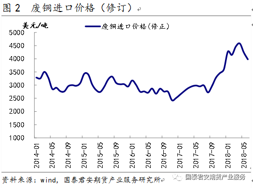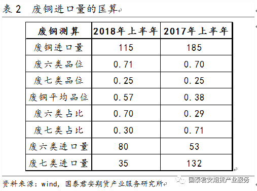在專題報告《從供應端分析禁止進口“廢七類”對銅價影響》(發表于2017年8月8日)中,我們設定參數對進口廢銅進行了測算,最終測算的結果和得出的結論在2017年下半年銅價走勢中得到了驗證。鑒于此,我們延續該篇報告的測算方法,并根據實際貿易情況將相關參數進行了調整。其中,根據《進口可用作原料的固體廢物環境保護控制標準—廢有色金屬》(2018年3月1日起正式實施),其他銅廢碎料(廢六類)中應限制其他夾雜物混入總重量不應超過進口廢有色金屬總重量的1.0%,較2005年的標準下降1個百分點,我們將進口廢六類品位從此前的70%上調至71%。同時,根據單位廢銅進口價格的變化[1],將2018年上半年廢銅平均品位上調至0.57。計算結果顯示,上半年中國進口廢六類79萬噸(約57.18萬金屬噸),進口廢七類36萬噸(約8.97萬金屬噸),合計進口總量約66.15萬金屬噸,較去年同期僅減少5.15萬金屬噸。由此來看,上半年進口廢銅并沒有如預期大幅減少,對銅價的支撐力度不足,倫銅價格從年初的7250美元/噸跌至6月末的6619美元/噸,跌幅8.7%。