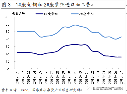 第二,國外拆解廢銅成本明顯高于國內,亦限制了國內企業到國外建廠的積極性。在專題報告《從供應端分析禁止進口“廢七類”對銅價影響》(發布于2017年8月8日)中,我們闡述了由于運輸、關稅以及國家政策的不確定性等均會額外增加廢銅拆解的額外成本,企業海外建廠拆解的動力不足。中國從東南亞進口廢七類相對偏多,以市場比較關注的馬來西亞為例,中國從該國進口廢銅從2017年7月的1.9萬噸,下降至12月的0.32萬噸,且2018年依然處于下降的狀態,可以推斷在中國提出限制進口廢七類后長達至少8個月的時間內,該國沒有新投建廢銅拆解產能。