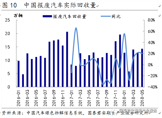 2000年來,中國汽車銷量年均增速高達17%,截至2018年6月,汽車保有量攀升至2.29億輛。理論上,汽車行業經歷20年高速發展后,將會有大量的汽車到了報廢期,中國物資再生協會數據顯示,2017年報廢產量應該達到244萬輛,2018年估計將達到354萬輛,但實際的統計數據顯示,2017年僅報廢了147.4萬輛,2018年1-5月報廢了59.6萬輛,預計全年報廢170萬輛左右,均低于預期值,我們認為主要有兩方面的原因: