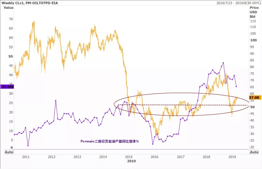 這里面有一張圖,是美國頁巖油最主要的二疊紀盆地的產出同比增速和油價之間的關系,為什么要用產出同比增速數據呢?單一的鉆井數量在這兩年的經驗總結中其實不難發現,會存在提升單井效率的問題,所以最直接的看直接變量,那就是產量,用二疊紀盆地的產出同比增速,更能敏感的看到油價和產出增速之間表現的一些關系;