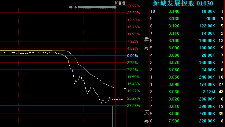 二級市場上,昨日新城旗下港股新城發展控股盤尾閃崩,狂泄23.86%收盤,市值蒸發了近150億港元。與此同時,新城悅股價也在一小時內大跌23.72%。